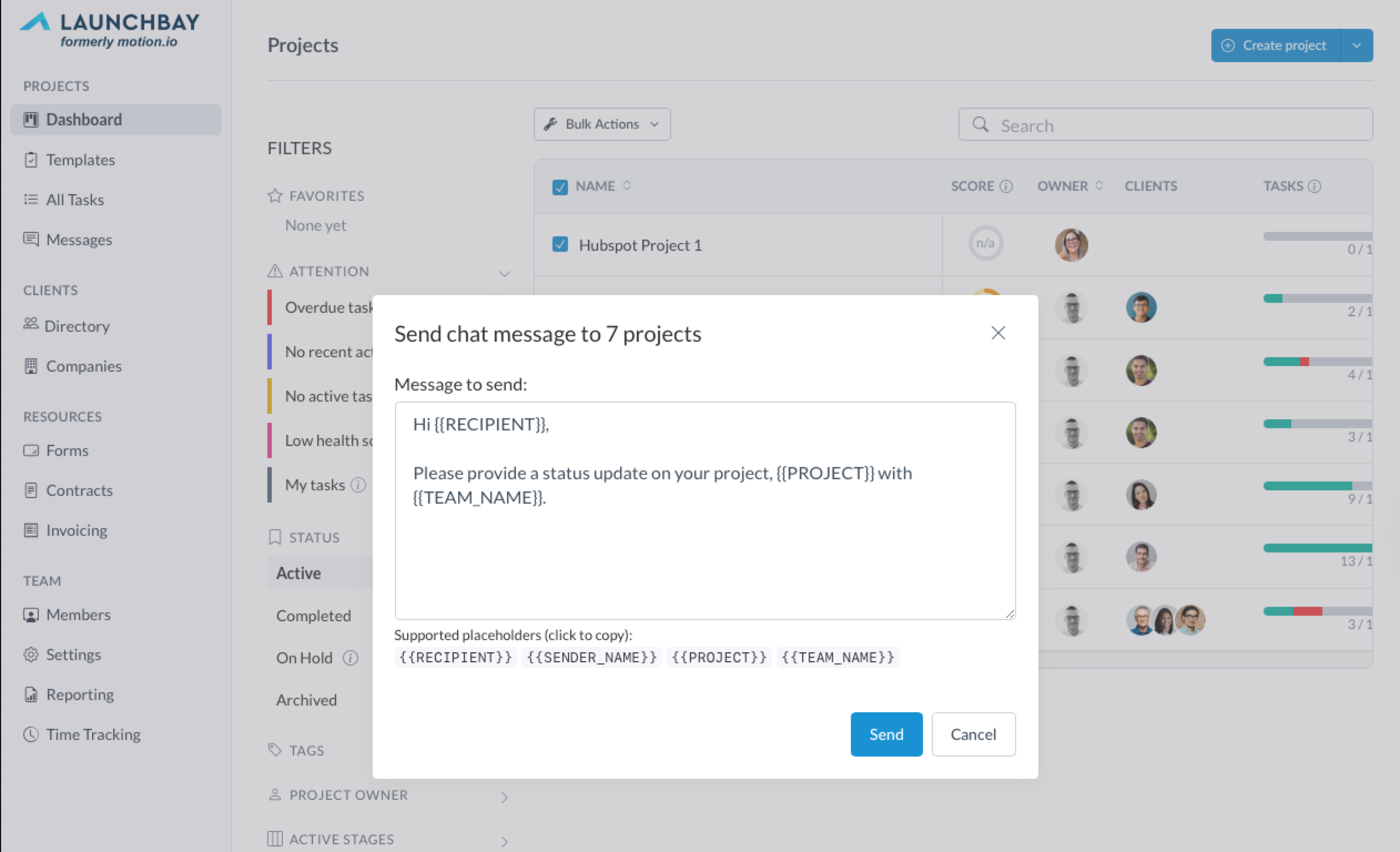 The final bulk action covered in this guide—"Send bulk chat message"—lets you select projects from your dashboard and send a custom message to the "Chat" page clients can access in their portals.