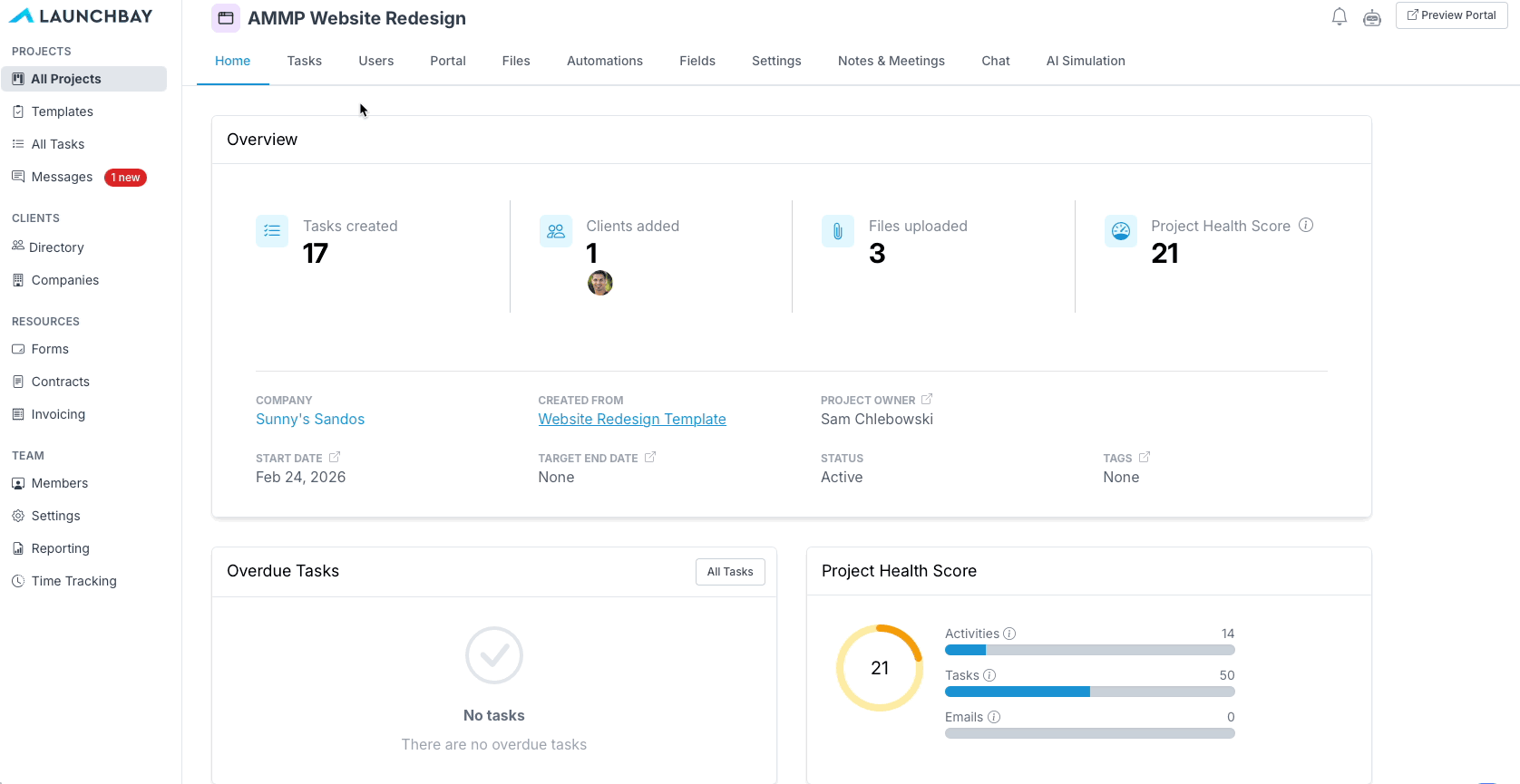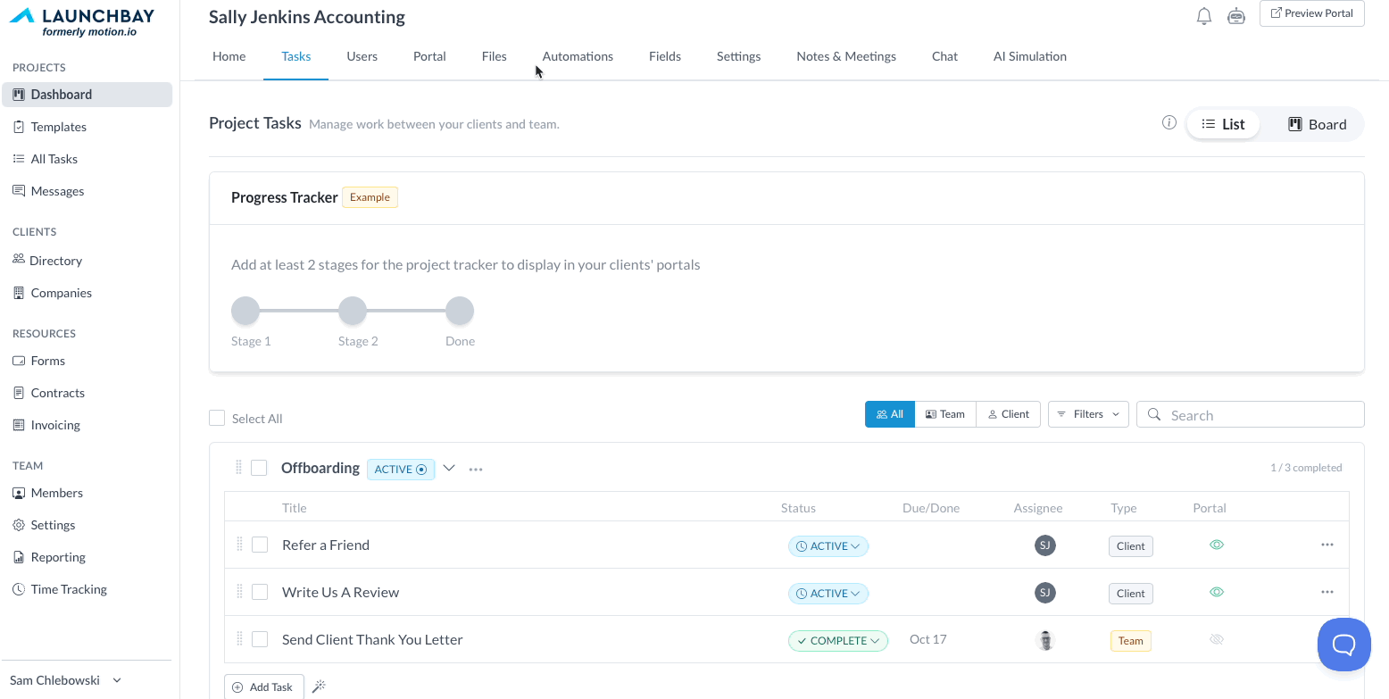 In LaunchBay, the way your team creates and manages tasks, communicates, and controls what information clients have access to is through projects. Portals your client's view of a project and where they go to complete tasks and view information about the projects you've invited them to.