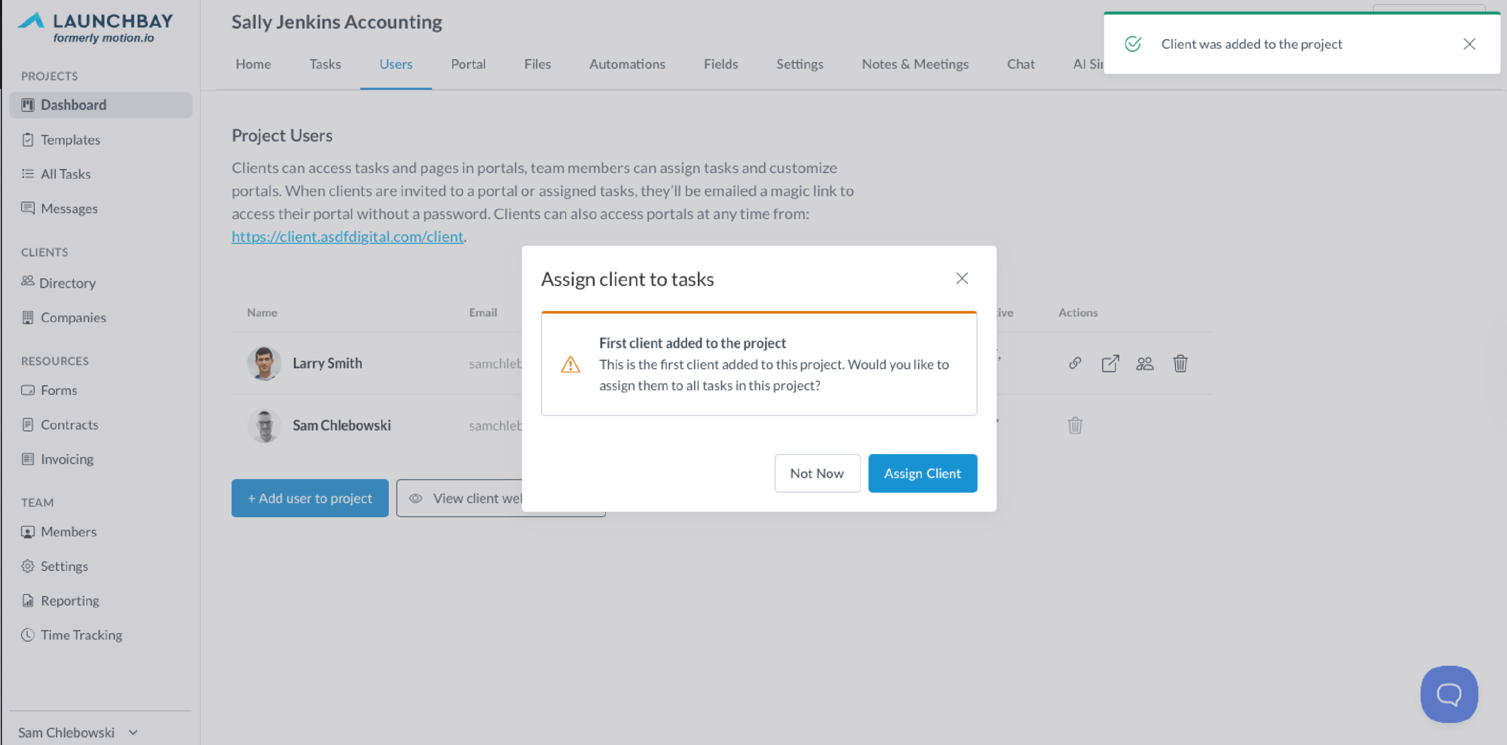If this is the first client you are adding to a project, you will see a "Assign client to tasks" notice. This will allow you to automatically assign all tasks in the project to this client. If not, click "Not Now" and you can bulk assign tasks later.