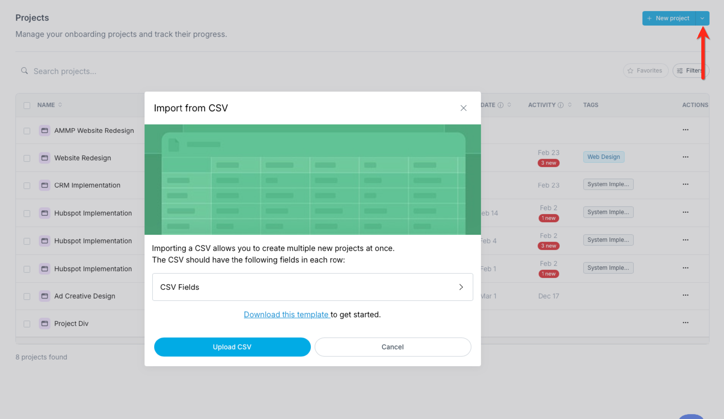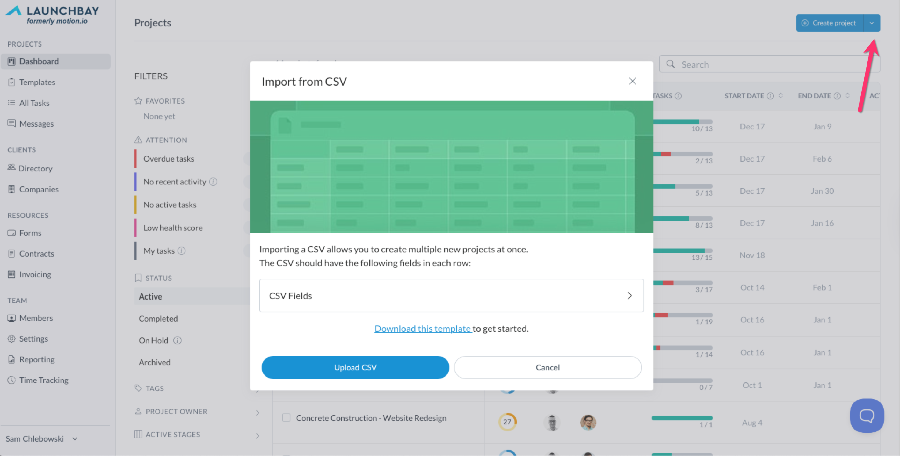 To import clients from a CSV file, click the dropdown on the arrow on the "Create Project" button of your LaunchBay project dashboard and select "Import CSV."