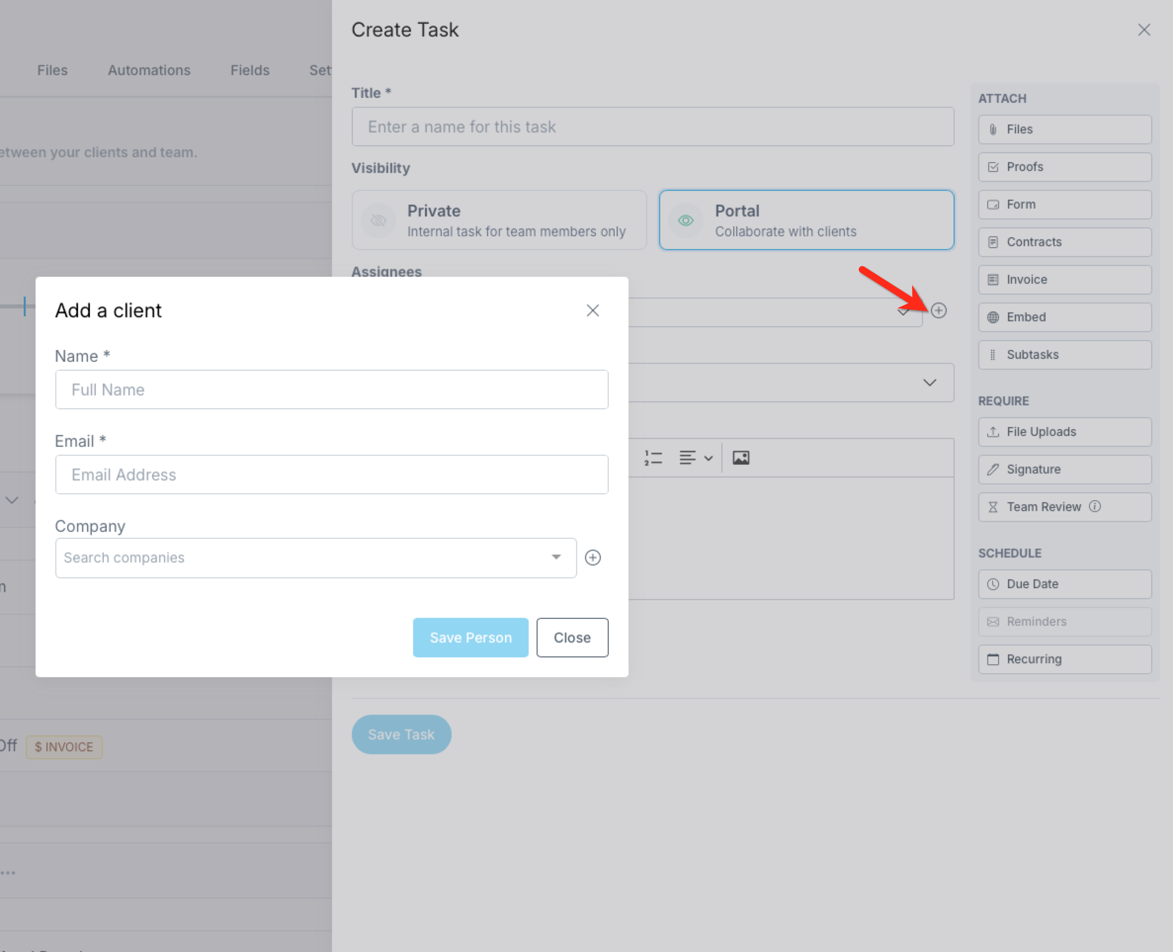 Select a task you're ready to assign a client, click "Edit task" , then "Add new client" button that appears near the top of the task composer. Enter your client's name and email and click "Save Person."