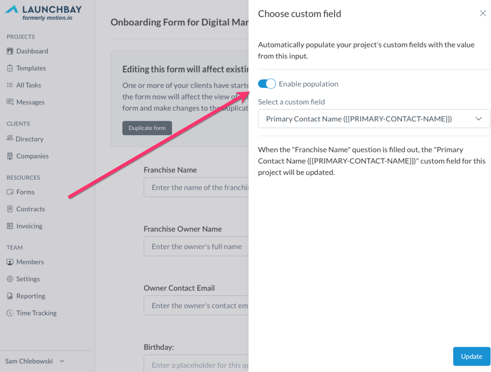 In the slideout on the right side of your screen, click "Enable population" and specify the custom field you'd like to populate with information your clients enter into the field of that form.